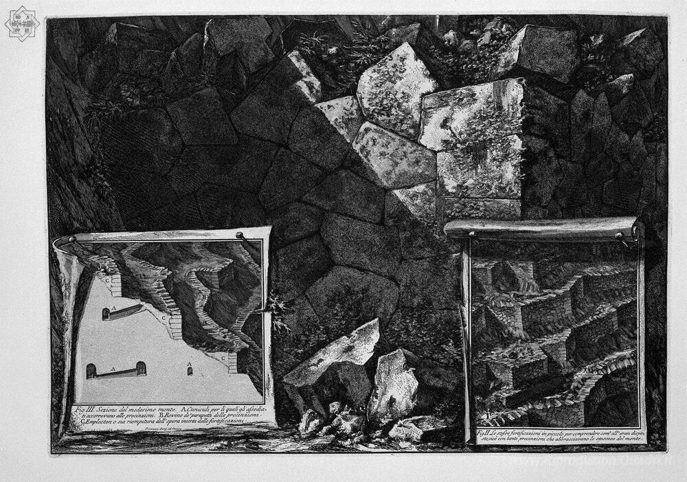 Ti offriamo una riproduzione artigianale su tela dell'opera famosa 'Le rovine delle antiche fortificazioni della montagna e la città' di Giovanni Battista Piranesi, dal Museo delle Riproduzioni.