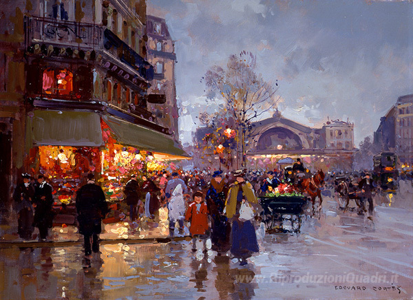 Ti offriamo una riproduzione artigianale su tela dell'opera famosa 'Les Halles' di Edouard Cortes, dal Museo delle Riproduzioni.