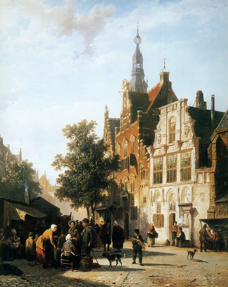 Ti offriamo una riproduzione artigianale su tela dell'opera famosa 'Marketview con cityhall Woerden' di Cornelis Springer, dal Museo delle Riproduzioni.