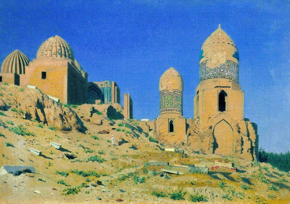 Ti offriamo una riproduzione artigianale su tela dell'opera famosa 'Mausoleo di Shah-i-Zinda a Samarcanda' di Vasily Vereshchagin, dal Museo delle Riproduzioni.