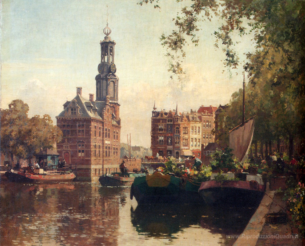 Ti offriamo una riproduzione artigianale su tela dell'opera famosa 'Mercato dei fiori sul Singel, Amsterdam, con il Munttoren Beyond' di Cornelis Vreedenburgh, dal Museo delle Riproduzioni.