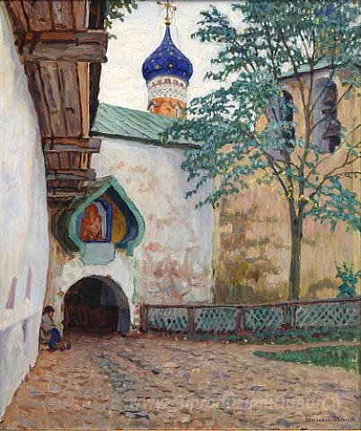 Ti offriamo una riproduzione artigianale su tela dell'opera famosa 'Monastero di Pechersky' di Nikolay Bogdanov-Belsky, dal Museo delle Riproduzioni.
