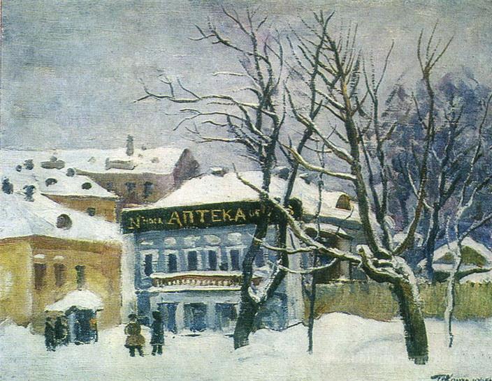 Ti offriamo una riproduzione artigianale su tela dell'opera famosa 'Mosca. Farmacia a Sadovaya.' di Pyotr Konchalovsky, dal Museo delle Riproduzioni.