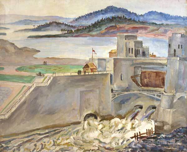 Ti offriamo una riproduzione artigianale su tela dell'opera famosa 'Murmansk. Tulomstroy. Sfioratore.' di Pyotr Konchalovsky, dal Museo delle Riproduzioni.