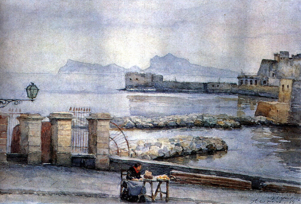 Ti offriamo una riproduzione artigianale su tela dell'opera famosa 'Napoli. Enbankment.' di Vasily Surikov, dal Museo delle Riproduzioni.