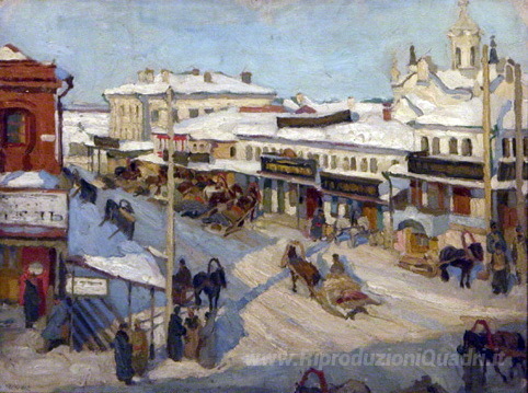 Ti offriamo una riproduzione artigianale su tela dell'opera famosa 'Nizhny Novgorod in inverno' di Konstantin Yuon, dal Museo delle Riproduzioni.