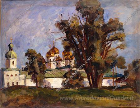 Ti offriamo una riproduzione artigianale su tela dell'opera famosa 'Novgorod. Monastero di San Giorgio.' di Pyotr Konchalovsky, dal Museo delle Riproduzioni.