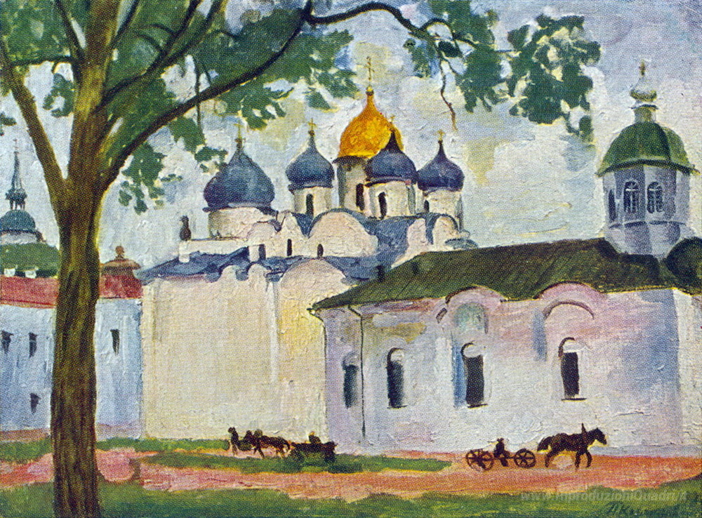 Ti offriamo una riproduzione artigianale su tela dell'opera famosa 'Novgorod. Piazza della Cattedrale di Santa Sofia.' di Pyotr Konchalovsky, dal Museo delle Riproduzioni.
