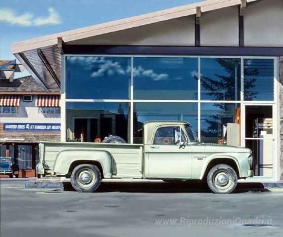 Ti offriamo una riproduzione artigianale su tela dell'opera famosa 'Oro Dodge' di Ralph Goings, dal Museo delle Riproduzioni.