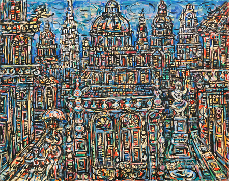 Ti offriamo una riproduzione artigianale su tela dell'opera famosa 'Paesaggio di L'Avana' di Rene Portocarrero, dal Museo delle Riproduzioni.