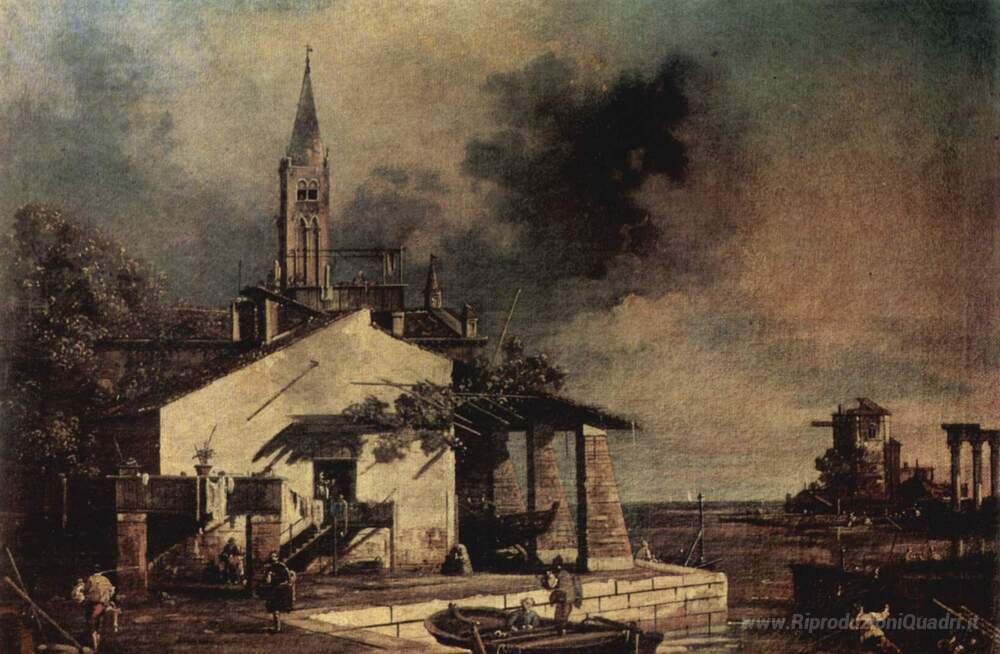 Ti offriamo una riproduzione artigianale su tela dell'opera famosa 'Paesaggio lagunare' di Bernardo Bellotto, dal Museo delle Riproduzioni.