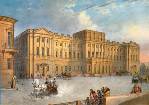 Ti offriamo una riproduzione artigianale su tela dell'opera famosa 'Palazzo Mariinsky come visto dal Ponte Blu' di Vasily Sadovnikov, dal Museo delle Riproduzioni.