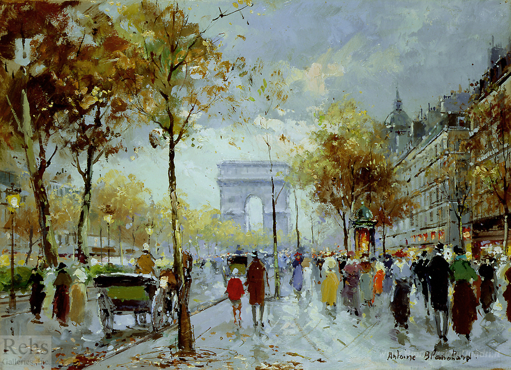 Ti offriamo una riproduzione artigianale su tela dell'opera famosa 'Parigi, les Champs Elysees' di Antoine Blanchard, dal Museo delle Riproduzioni.