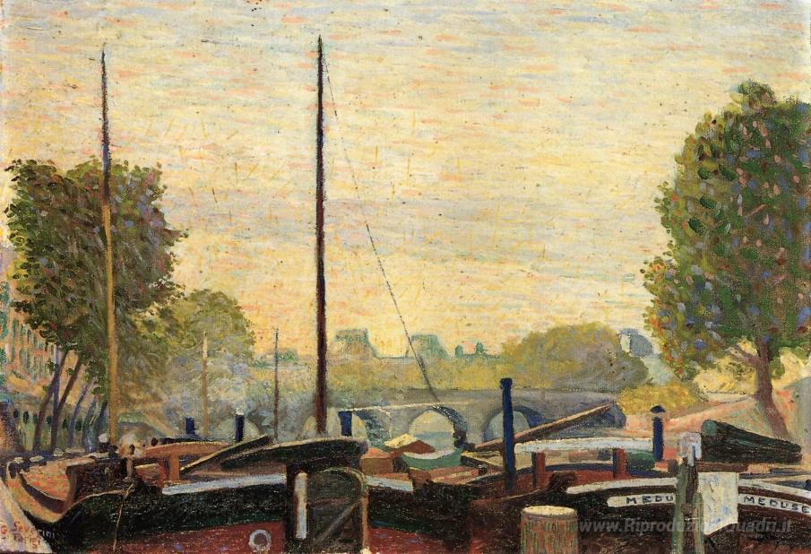 Ti offriamo una riproduzione artigianale su tela dell'opera famosa 'Paris, La Senna, le Chiatte del Louvre' di Gino Severini, dal Museo delle Riproduzioni.