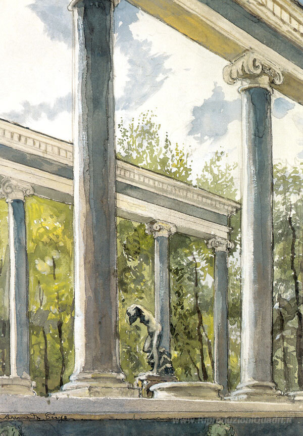 Ti offriamo una riproduzione artigianale su tela dell'opera famosa 'Peterhof Palace. Leone a cascata e colonnato' di Alexandre Benois, dal Museo delle Riproduzioni.