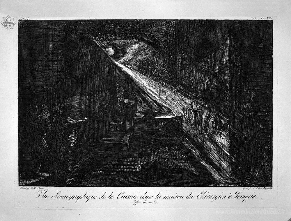 Ti offriamo una riproduzione artigianale su tela dell'opera famosa 'Piano e elevazione della cucina nella stessa' di Giovanni Battista Piranesi, dal Museo delle Riproduzioni.