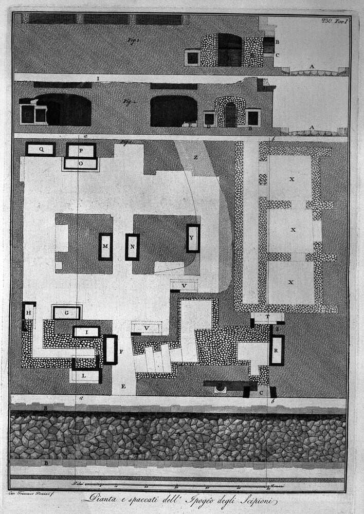 Ti offriamo una riproduzione artigianale su tela dell'opera famosa 'Piano e sezioni del Ipogeo degli Scipioni' di Giovanni Battista Piranesi, dal Museo delle Riproduzioni.