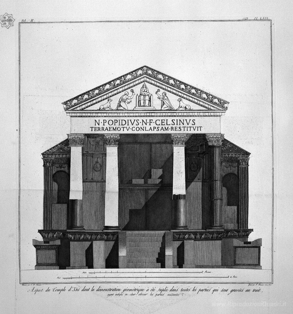 Ti offriamo una riproduzione artigianale su tela dell'opera famosa 'Piano nel grande tempio di Iside' di Giovanni Battista Piranesi, dal Museo delle Riproduzioni.