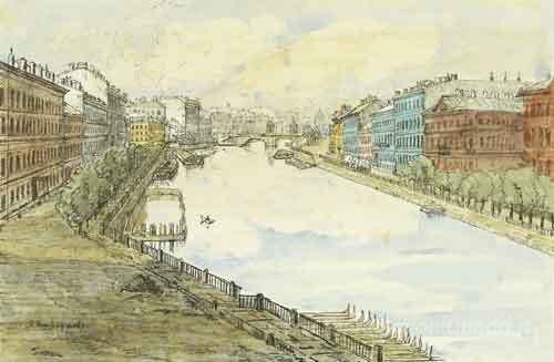 Ti offriamo una riproduzione artigianale su tela dell'opera famosa 'Pietroburgo. Fontanka.' di Anna Ostroumova-Lebedeva, dal Museo delle Riproduzioni.