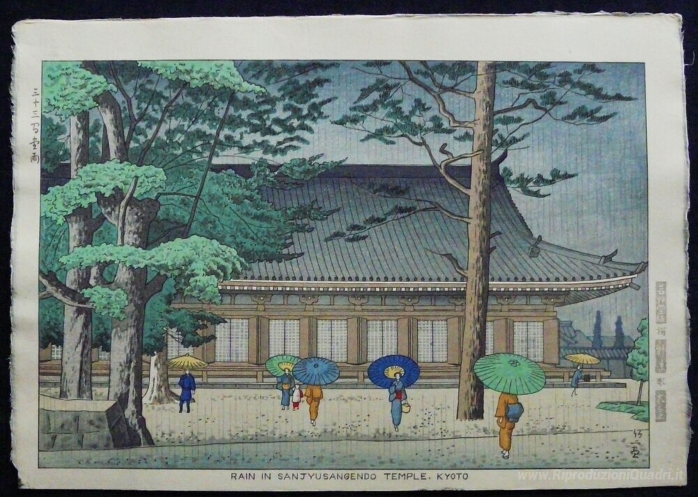 Ti offriamo una riproduzione artigianale su tela dell'opera famosa 'Pioggia a Sanjyusangendo Temple, Kyoto' di Asano Takeji, dal Museo delle Riproduzioni.
