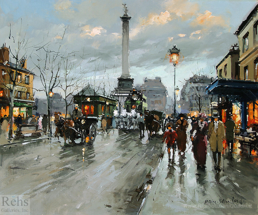 Ti offriamo una riproduzione artigianale su tela dell'opera famosa 'Place de la Bastiile' di Antoine Blanchard, dal Museo delle Riproduzioni.