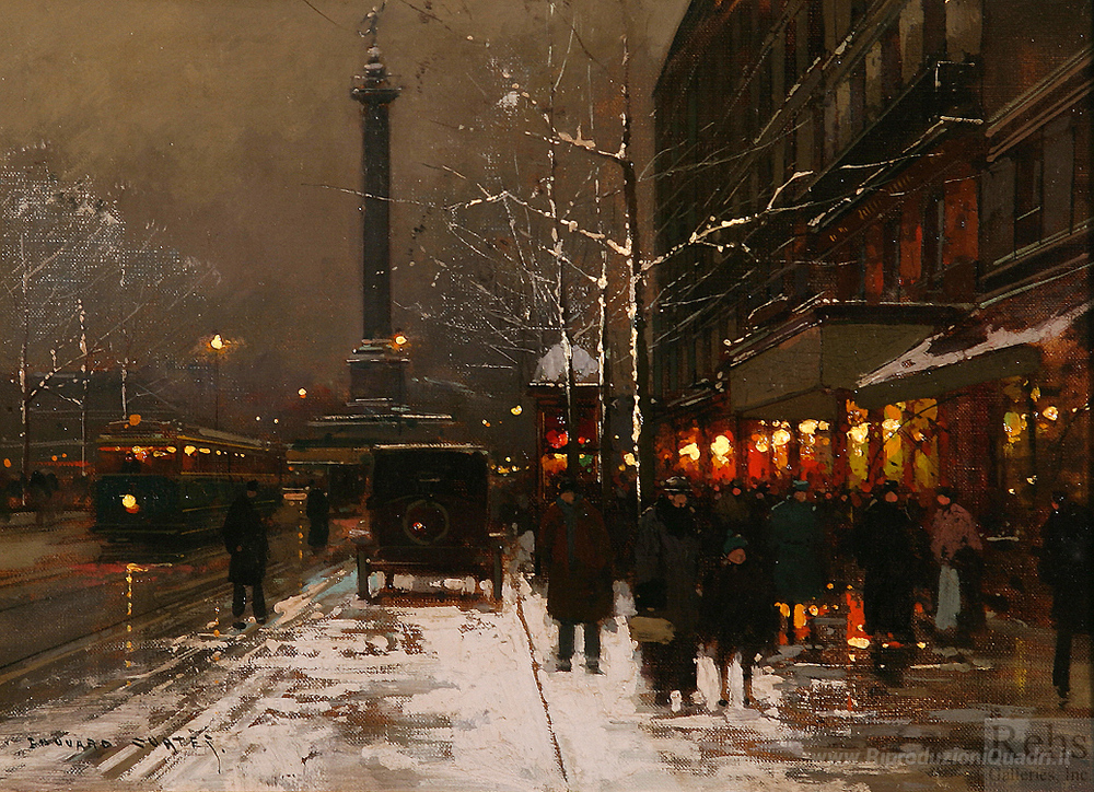 Ti offriamo una riproduzione artigianale su tela dell'opera famosa 'Place Vendome Paris Soir' di Edouard Cortes, dal Museo delle Riproduzioni.
