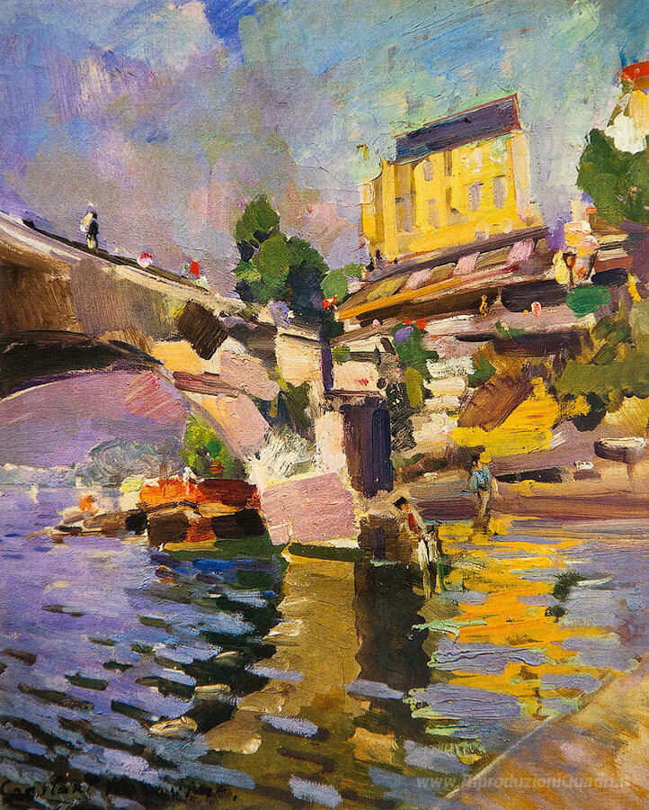 Ti offriamo una riproduzione artigianale su tela dell'opera famosa 'Ponte a Saint Cloud' di Konstantin Korovin, dal Museo delle Riproduzioni.