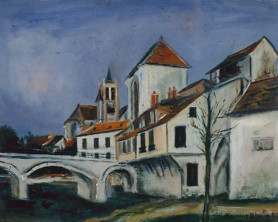 Ti offriamo una riproduzione artigianale su tela dell'opera famosa 'Ponte e Chiesa' di Maurice Utrillo, dal Museo delle Riproduzioni.