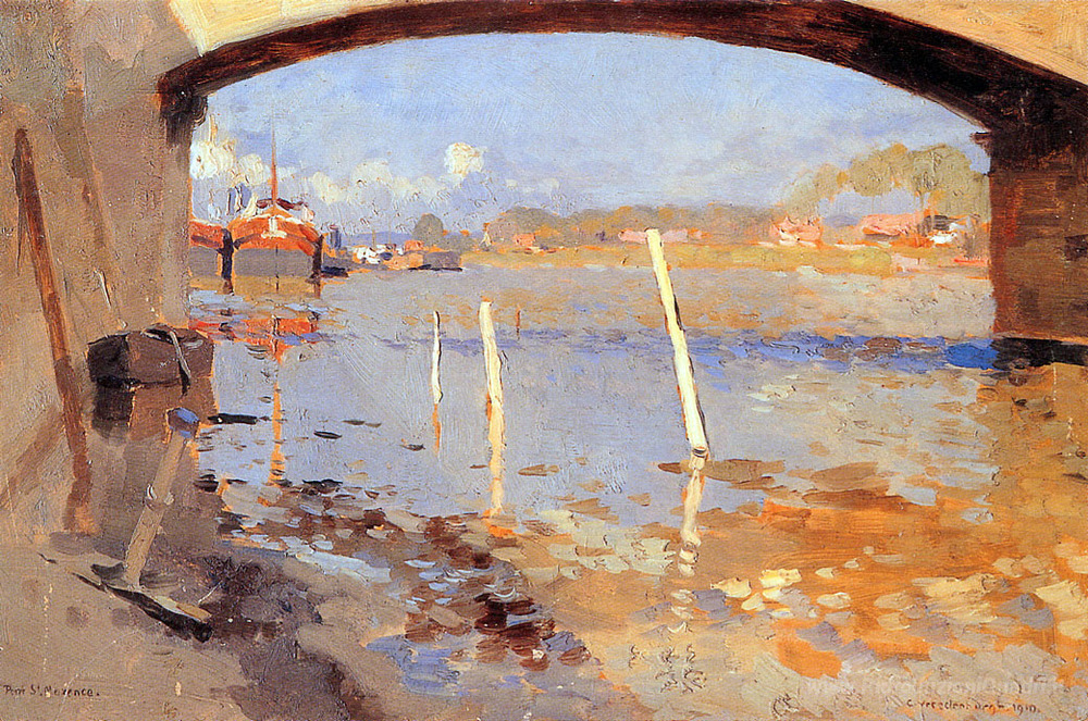 Ti offriamo una riproduzione artigianale su tela dell'opera famosa 'Pont-Sainte-Maxence' di Cornelis Vreedenburgh, dal Museo delle Riproduzioni.