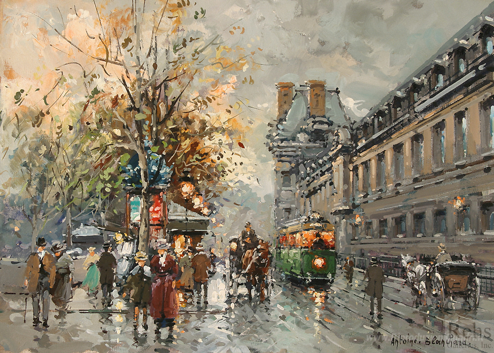 Ti offriamo una riproduzione artigianale su tela dell'opera famosa 'Porte Saint-Denis' di Antoine Blanchard, dal Museo delle Riproduzioni.