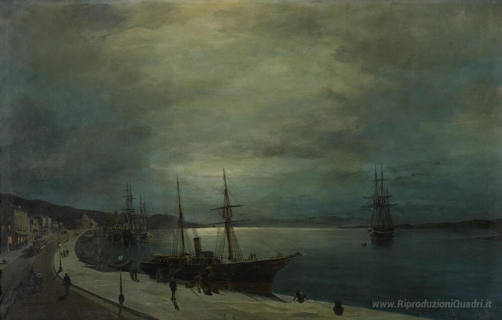 Ti offriamo una riproduzione artigianale su tela dell'opera famosa 'Porto al chiaro di luna' di Konstantinos Volanakis, dal Museo delle Riproduzioni.