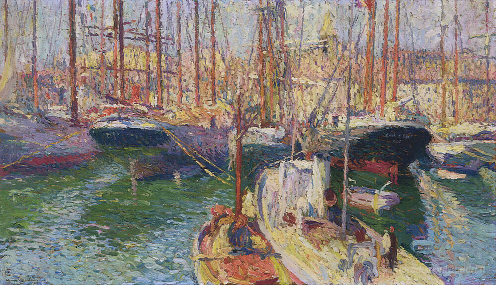 Ti offriamo una riproduzione artigianale su tela dell'opera famosa 'Porto di Marsiglia' di Henri Martin, dal Museo delle Riproduzioni.