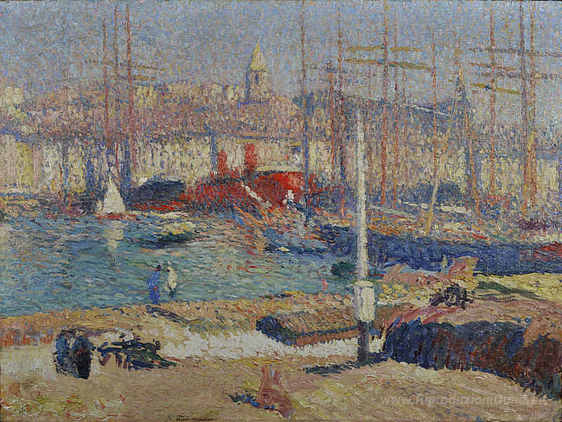 Ti offriamo una riproduzione artigianale su tela dell'opera famosa 'Porto di Marsiglia' di Henri Martin, dal Museo delle Riproduzioni.