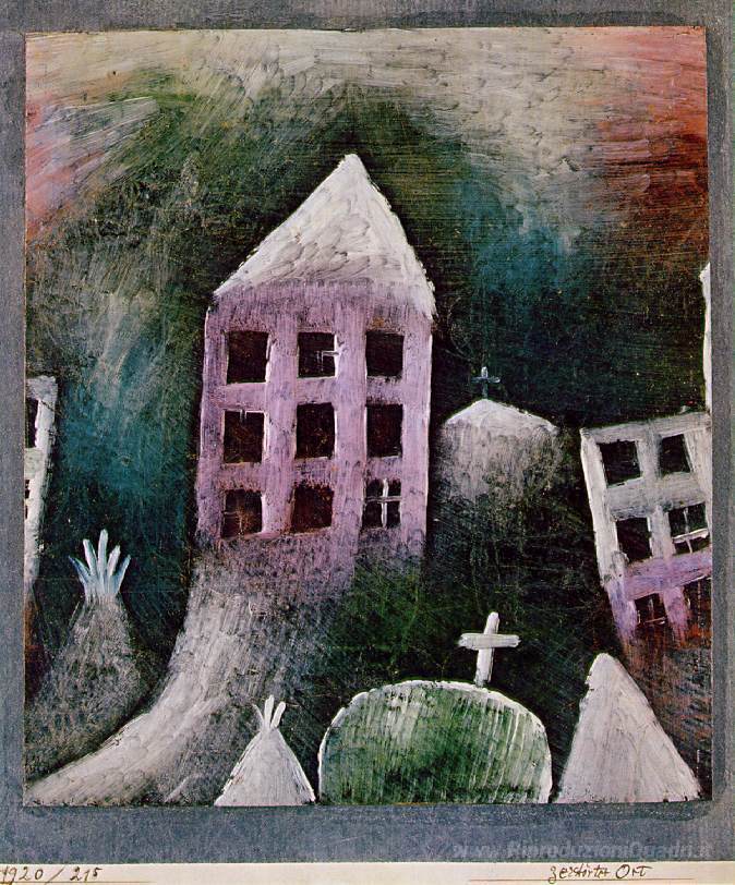 Ti offriamo una riproduzione artigianale su tela dell'opera famosa 'Posto Distrutto' di Paul Klee, dal Museo delle Riproduzioni.