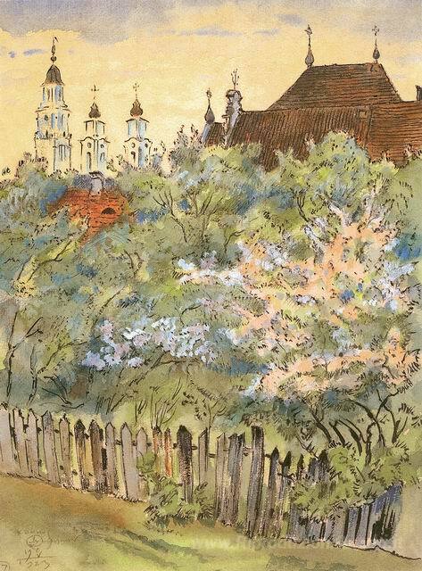 Ti offriamo una riproduzione artigianale su tela dell'opera famosa 'Primavera a Kaunas' di Mstislav Dobuzhinsky, dal Museo delle Riproduzioni.