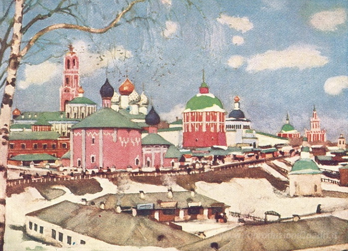 Ti offriamo una riproduzione artigianale su tela dell'opera famosa 'Provincia' di Konstantin Yuon, dal Museo delle Riproduzioni.