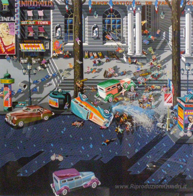 Ti offriamo una riproduzione artigianale su tela dell'opera famosa 'Robbers II' di Hiro Yamagata, dal Museo delle Riproduzioni.