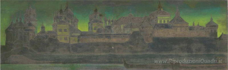 Ti offriamo una riproduzione artigianale su tela dell'opera famosa 'Rostov Velikij. Cremlino.' di Nicholas Roerich, dal Museo delle Riproduzioni.