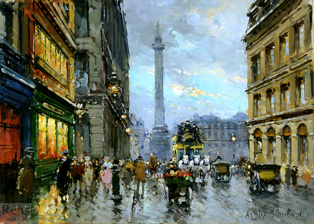 Ti offriamo una riproduzione artigianale su tela dell'opera famosa 'Rue de la Paix Place Vendome' di Antoine Blanchard, dal Museo delle Riproduzioni.
