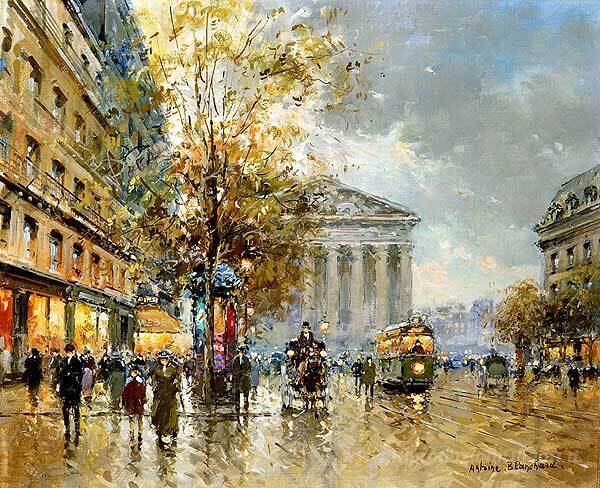 Ti offriamo una riproduzione artigianale su tela dell'opera famosa 'Rue Royal Madeleine' di Antoine Blanchard, dal Museo delle Riproduzioni.