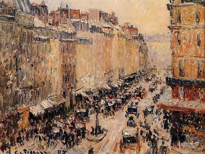 Ti offriamo una riproduzione artigianale su tela dell'opera famosa 'Rue Saint Lazare sotto neve' di Camille Pissarro, dal Museo delle Riproduzioni.