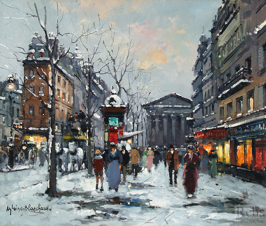 Ti offriamo una riproduzione artigianale su tela dell'opera famosa 'Rue Tronchet la Madeleine' di Antoine Blanchard, dal Museo delle Riproduzioni.