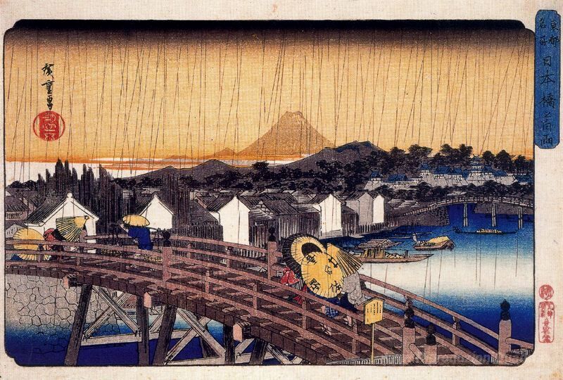 Ti offriamo una riproduzione artigianale su tela dell'opera famosa 'Sera Doccia a Nihonbashi Ponte' di Hiroshige, dal Museo delle Riproduzioni.