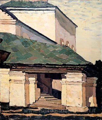 Ti offriamo una riproduzione artigianale su tela dell'opera famosa 'Smolensk. Il portico del convento.' di Nicholas Roerich, dal Museo delle Riproduzioni.