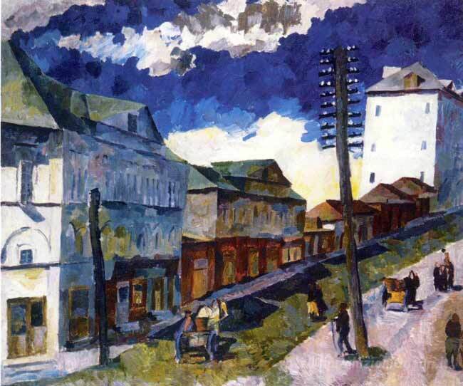 Ti offriamo una riproduzione artigianale su tela dell'opera famosa 'Street a Sergiev Posad' di Aristarkh Lentulov, dal Museo delle Riproduzioni.