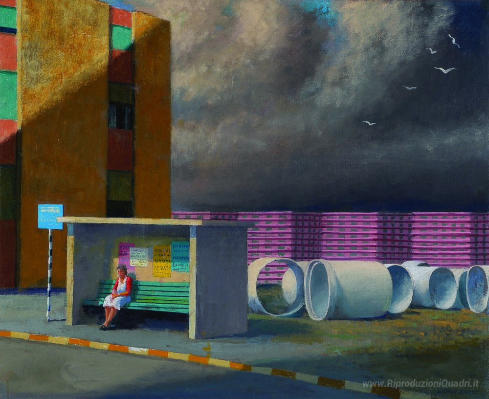 La tecnica pittorica di Jeffrey Smart si caratterizza per l'uso sapiente di colori vivaci e composizioni geometriche, che trasformano ogni dipinto in un'opera d'arte che arricchisce gli ambienti. Studio per 'fermata' non è solo un dipinto, ma un'esperienza visiva che esalta l'atmosfera del vostro spazio, creando un dialogo tra la bellezza dell'arte e l'intimità della vostra casa. Scegliendo questo capolavoro, porterete un pezzo di emozione e cultura italiana nella vostra vita quotidiana.