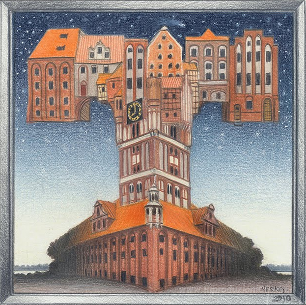 Ti offriamo una riproduzione artigianale su tela dell'opera famosa 'T 'come Toruń' di Jacek Yerka, dal Museo delle Riproduzioni.