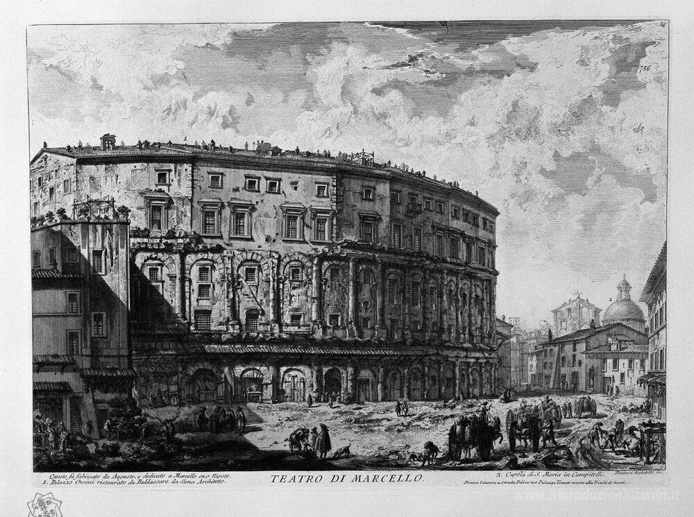 Ti offriamo una riproduzione artigianale su tela dell'opera famosa 'Teatro di Marcello' di Giovanni Battista Piranesi, dal Museo delle Riproduzioni.