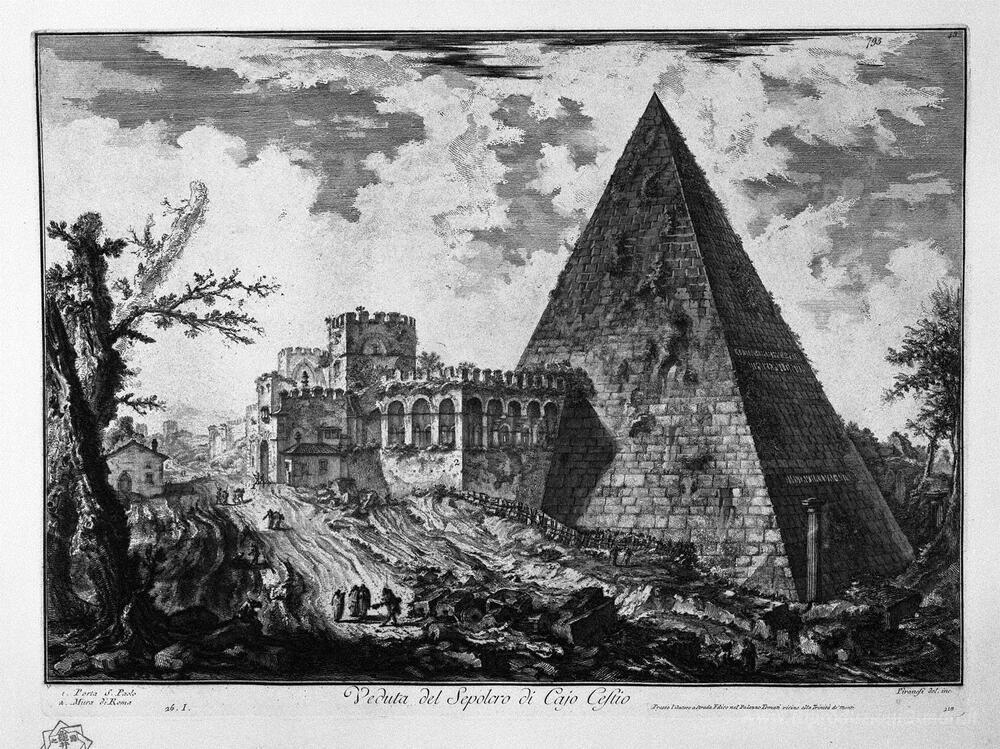Ti offriamo una riproduzione artigianale su tela dell'opera famosa 'Tenuto conto della tomba di Caio Cestio' di Giovanni Battista Piranesi, dal Museo delle Riproduzioni.