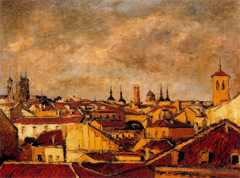 Ti offriamo una riproduzione artigianale su tela dell'opera famosa 'Tetti di Madrid' di Arturo Souto, dal Museo delle Riproduzioni.